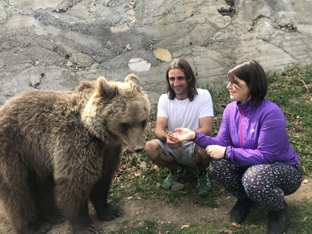 Our primary concern was providing adequate space for all the animals, ensuring their comfort and security. As you can see, the space is still undergoing development, and come summer, we plan to expand Maša’s and Ljubica’s areas. We aim to construct a pool and a pond for them to enjoy. We’re envisioning a space spanning several thousand square meters. During the off-season when guests aren’t around, we allow them access to the lower pool. For winter, they have their built-in huts, but they occasionally opt to create their dens. With winters becoming milder and a steady food supply, they hibernate less. Or rather, their hibernation patterns have shifted. Lately, they’ve been retreating to the huts, spending days gathering leaves and branches to fashion cozy beds for themselves. They do it so skillfully that it almost tempts me to join them. Bears are incredibly versatile creatures; they excel at swimming, outrun any of our dogs (laughs), climb trees, dig tunnels… They’re remarkably resourceful. When they play with our dogs, they often playfully “put them in their place” with a swift swipe of their paws, asserting their dominance.