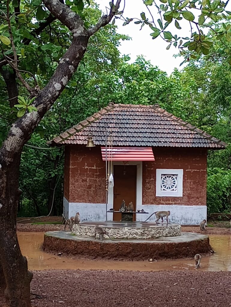The incessant drizzles, chill weather, tall trees all around, chirping of birds, rattling of insects, little forest flowers of yellow, blue and white here and there at once thrilled us. Soon we were ushered in to the simple tile-roofed cottage, Dhyana, a 1000 square feet hall, with three feet high raised cement platforms on all the four side walls to be used as a cot to sleep in which mats and pillows were arranged in rows. In the adjacent kitchen, guests are allowed to cook vegan food. After resting for a while, Shankar Narayan took us around the forest he himself had meticulously cultivated by sowing seeds of 2000 plants and trees, of which many are fruit-bearing. He said that wild animals such as deer, nilgai, boar, porcupine, peacock, bonnet macaque, Indian giant squirrels, gray langurs, mongoose, owls and rabbits are regular visitors to this jungle. While roaming around the woods, we could see hornbills waiting for their prey rubbing their yellow beaks in trees, a couple of Malabar giant squirrels enjoying a ripe jackfruit and a barrel of monkeys jumping from tree to tree. In the couple of rain-water retention ponds, little birds were bathing and drinking water.